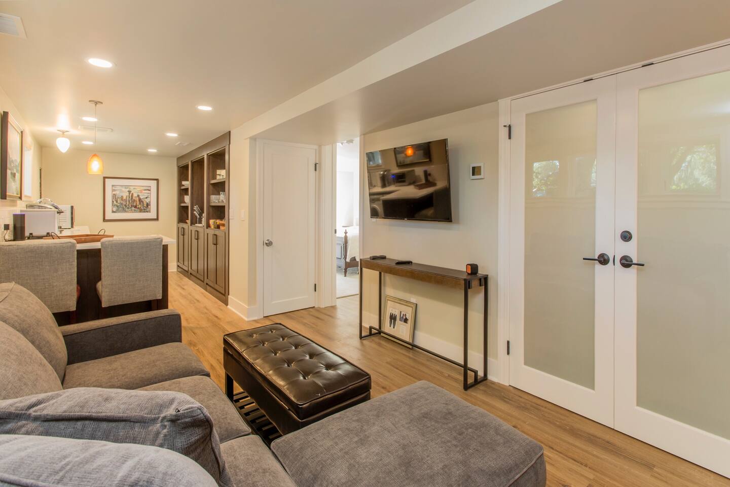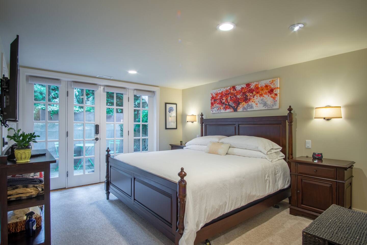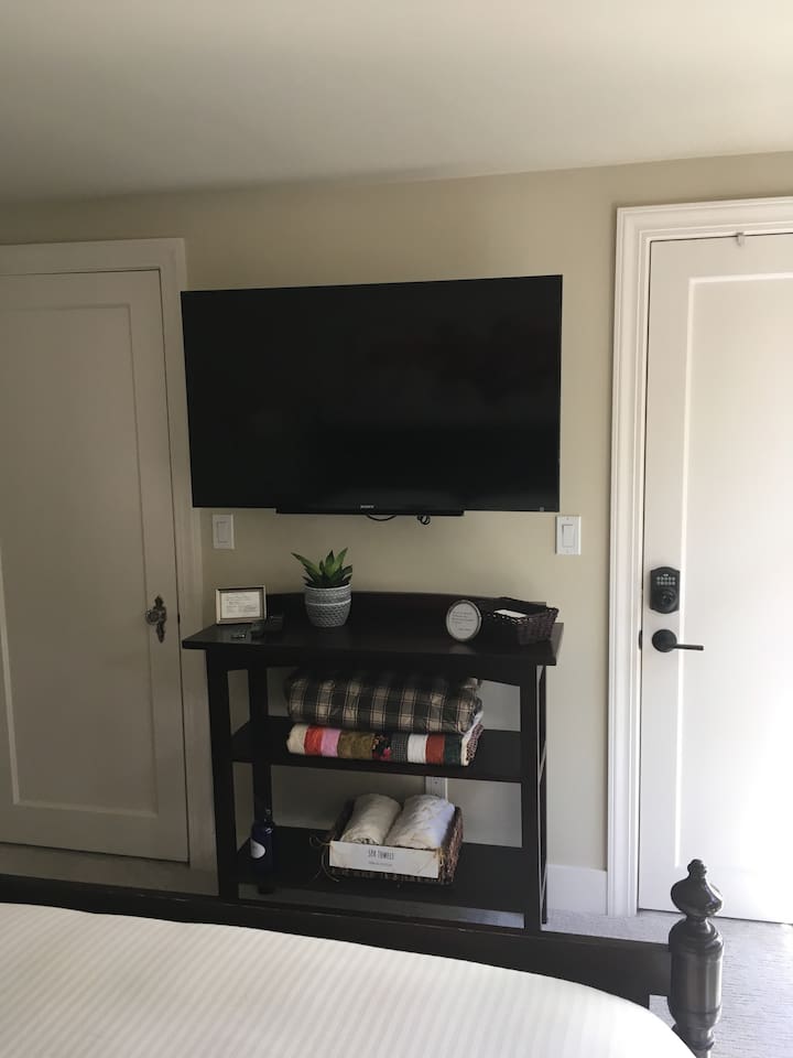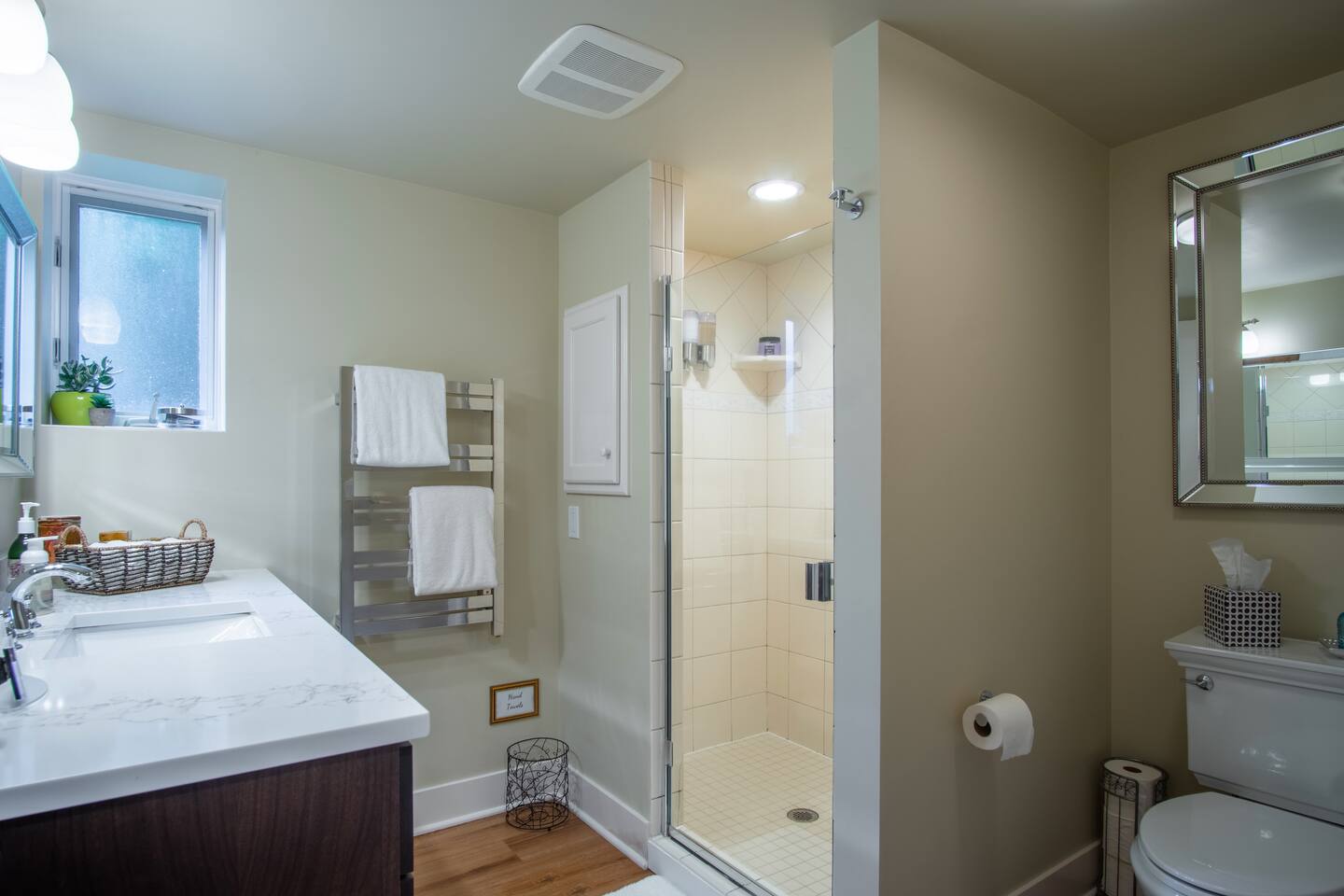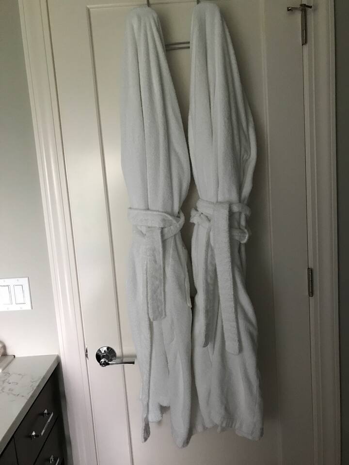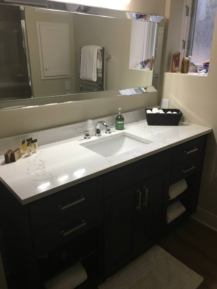 INSIDE THE HOUSE This new renovated house included the main house and private guest suite. A total of five bedrooms, four bathrooms, two kitchens and amenities that will give you and your guests a total five star stay. Inside, an open concept living area shares space with the kitchen and dining rooms. Hardwood floors and classic furnishings characterize this home, with a large flat-screens in most of the rooms. Outside awaits your private courtyard. Sit outside with a glass of wine while the sun sets over the Seattle skyline and soak away the day! Enjoy a warm soak in the swim spa - it's 19' long for an around aquatic workout - it's large enough for everyone to soak. Towels along with kid and adult robes for everyone. For our guest's security, four outside cameras have been placed at each entrance of the house. The bedroom has a large king bed and patio access. If you can’t bear to leave work behind completely, you’ll appreciate the desk and chair that share the spacious room. An en-suite bathroom has a walk in shower and single vanity.