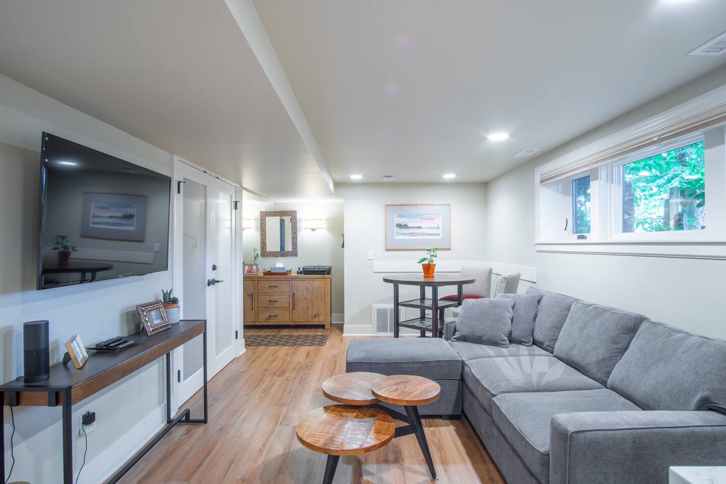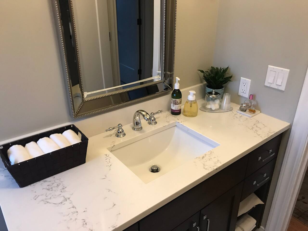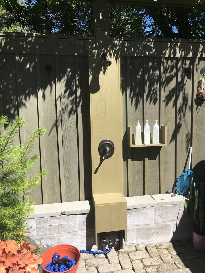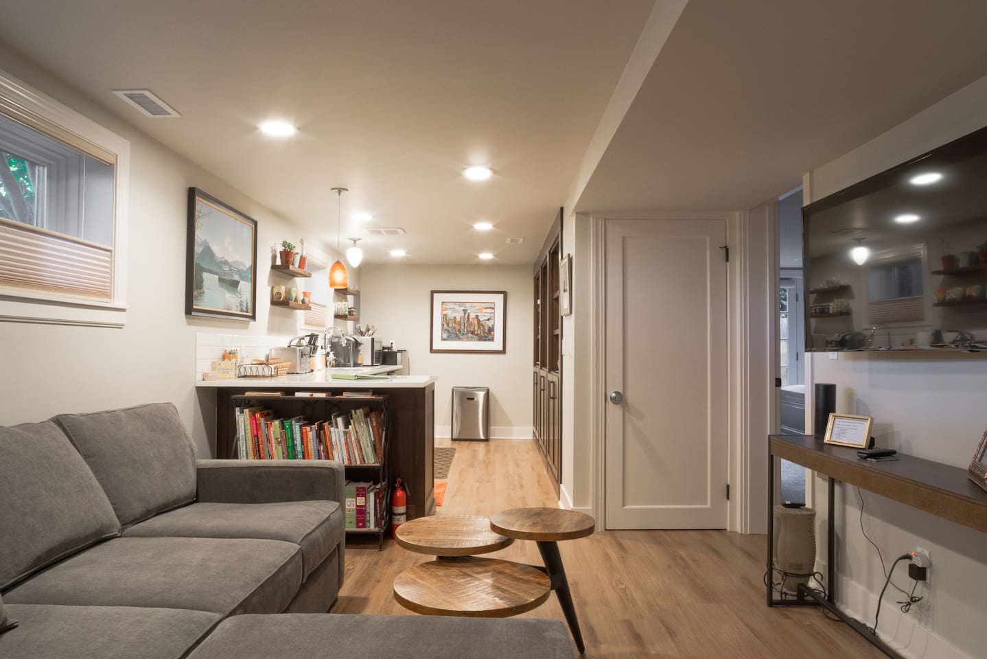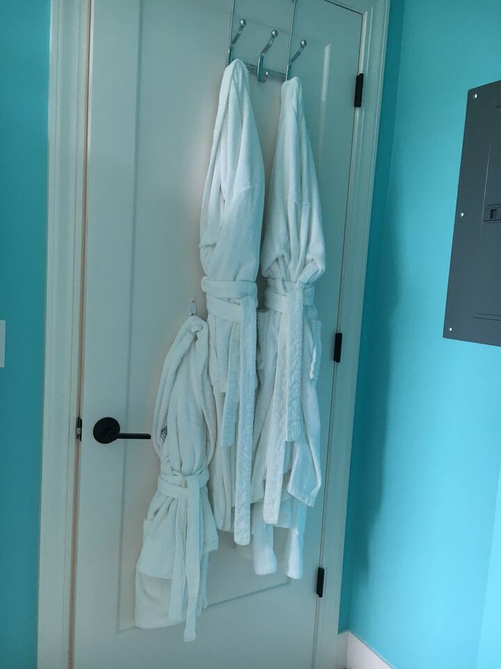 INSIDE THE HOUSE This new renovated house included the main house and private guest suite. A total of five bedrooms, four bathrooms, two kitchens and amenities that will give you and your guests a total five star stay. Inside, an open concept living area shares space with the kitchen and dining rooms. Hardwood floors and classic furnishings characterize this home, with a large flat-screens in most of the rooms. Outside awaits your private courtyard. Sit outside with a glass of wine while the sun sets over the Seattle skyline and soak away the day! Enjoy a warm soak in the swim spa - it's 19' long for an around aquatic workout - it's large enough for everyone to soak. Towels along with kid and adult robes for everyone. For our guest's security, four outside cameras have been placed at each entrance of the house. The bedroom has a large king bed and patio access. If you can’t bear to leave work behind completely, you’ll appreciate the desk and chair that share the spacious room. An en-suite bathroom has a walk in shower and single vanity.