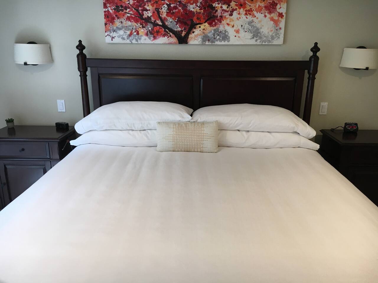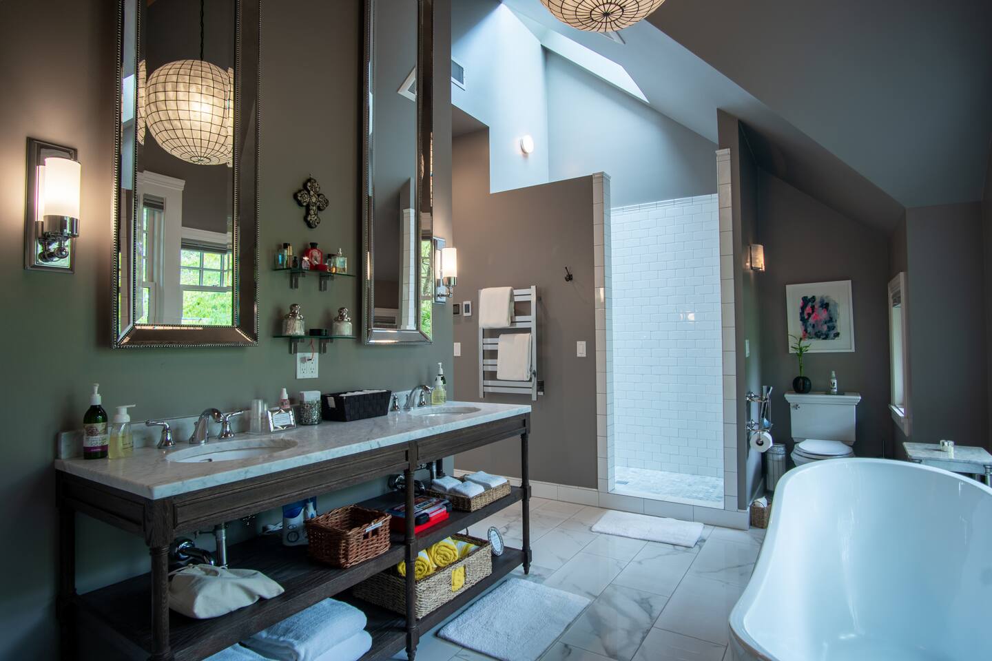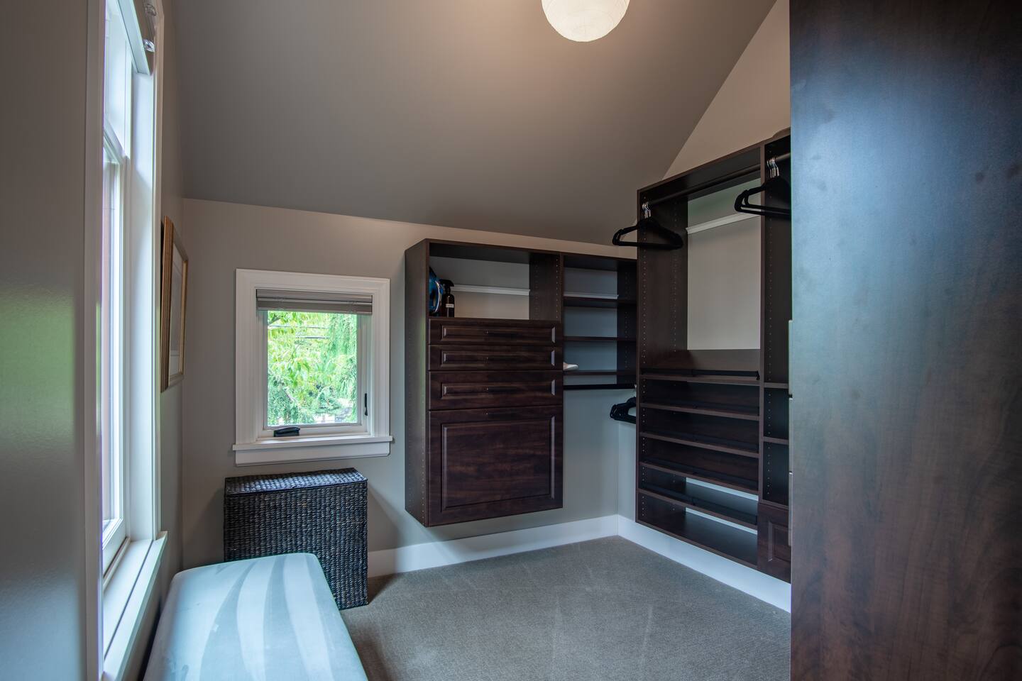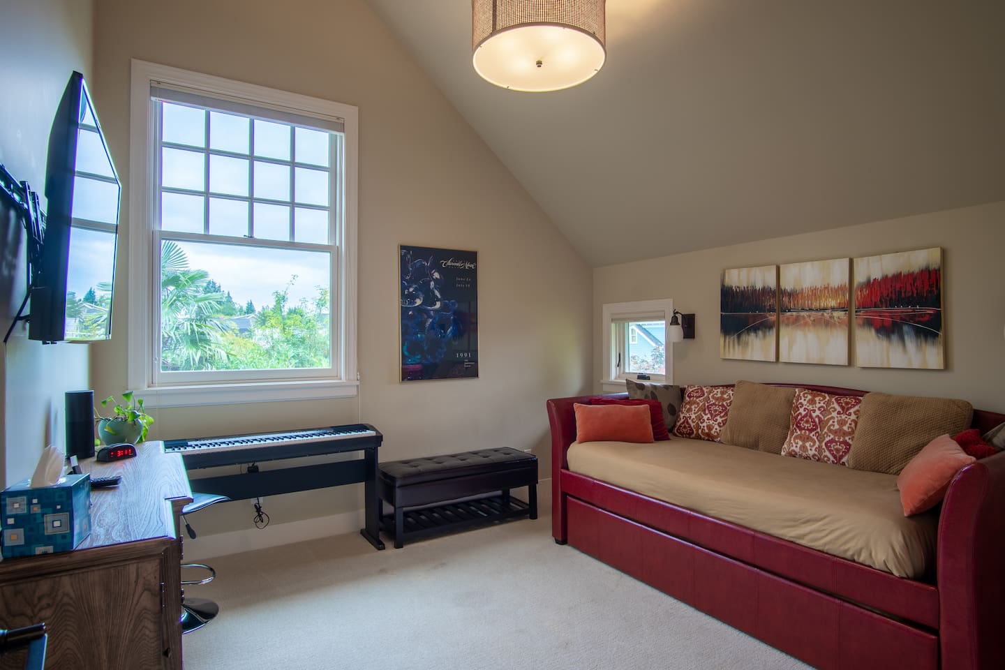 INSIDE THE HOUSE This new renovated house included the main house and private guest suite. A total of five bedrooms, four bathrooms, two kitchens and amenities that will give you and your guests a total five star stay. Inside, an open concept living area shares space with the kitchen and dining rooms. Hardwood floors and classic furnishings characterize this home, with a large flat-screens in most of the rooms. Outside awaits your private courtyard. Sit outside with a glass of wine while the sun sets over the Seattle skyline and soak away the day! Enjoy a warm soak in the swim spa - it's 19' long for an around aquatic workout - it's large enough for everyone to soak. Towels along with kid and adult robes for everyone. For our guest's security, four outside cameras have been placed at each entrance of the house. The bedroom has a large king bed and patio access. If you can’t bear to leave work behind completely, you’ll appreciate the desk and chair that share the spacious room. An en-suite bathroom has a walk in shower and single vanity.